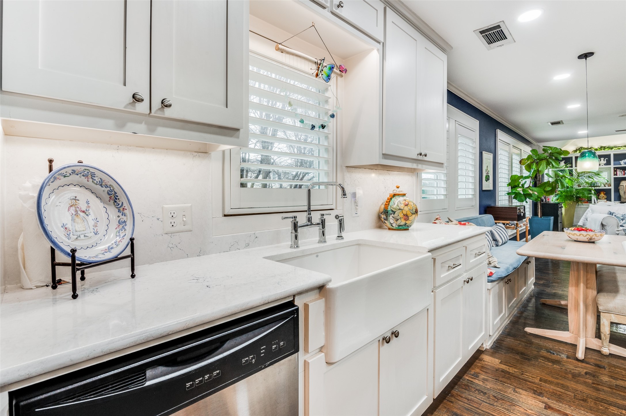 Discover this delightful Tudor gem in the heart of Elmwood! This charming home features beautiful wood floors throughout and built-ins offering plenty of storage. The open-concept living and kitchen updated in 2022 area is perfect for entertaining, with a gas range, quartz countertops, and a cozy built-in breakfast nook. Enjoy the elegance of plantation shutters and the convenience of a walk-in utility room with built-in shelving. All systems were updated in 2015. Gorgeous covered deck off the kitchen provides plenty of shade and comfort. The versatile garage can be used as a studio, office or for parking, and the landscaped backyard is perfect for outdoor activities. The master bath updated 2022 is a true retreat with marble counters, a rain showerhead, and ample storage. Exterior painted in 2024. This home is truly a 'little gem' with high improvements and lovely upgrades throughout.